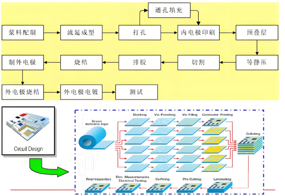 El proceso central deLTCCLa tecnología es la siguiente: primero, se mezclan polvo de cerámica, polvo de vidrio y aglutinantes orgánicos, y luego se procesan en cintas de cerámica verde con un grosor preciso y una estructura densa a través de la fundición, el secado y otros procesos. Posteriormente, los patrones de circuito requeridos se fabrican en las cintas de cerámica verde utilizando tecnologías como perforación láser, lechada de microholes e impresión de pasta de conductores de precisión. A continuación, las múltiples cintas de cerámica verdes procesadas están laminadas e integradas, y se sinterizan en un entorno de baja temperatura por debajo de 900 ° C. Finalmente, se pueden producir dispositivos de chip; También puede incrustar múltiples componentes pasivos para formar un único sustrato de circuito multicapa de cerámica tridimensional; Además, los ICS y los dispositivos activos se pueden montar en su superficie para crear módulos funcionales integrados pasivos/activos. Esta tecnología puede promover aún más la miniaturización y la alta densificación de los circuitos, y es particularmente adecuado para la fabricación de componentes en el campo de comunicación de alta frecuencia.